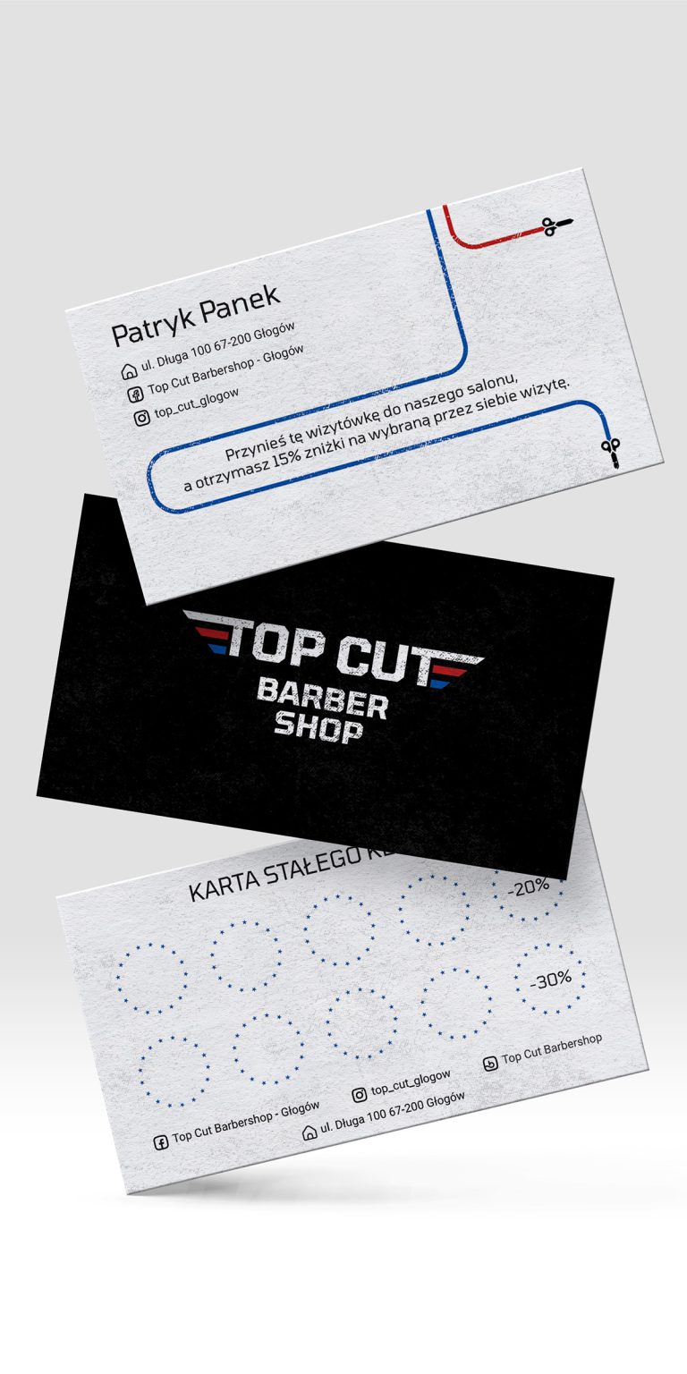 Projekt identyfikacji wizualnej inspirowany estetyką Top Gun. Logo, wizytówka i karta stałego klienta stworzone z myślą o nowoczesnym barbershopie – elegancko, stylowo i z wyraźnym męskim akcentem.